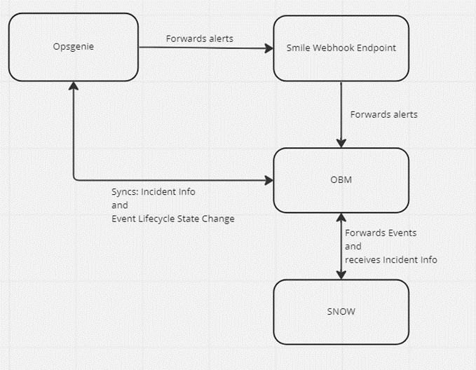 - Opsgenie generates alerts and forwards them to OBM using a custom-developed adapter (We call it smile webhook adapter).