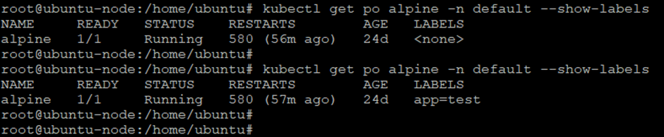 I ran couple of queries, in the below snap, I tried to add a label to a pod