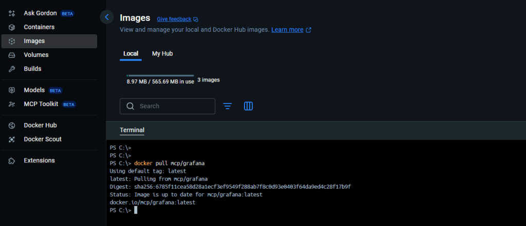 Now VS Code knows how to start your Grafana MCP server automatically. Before you start prompting the Agent, pull the docker image: Grafana MCP by running below command on the terminal.