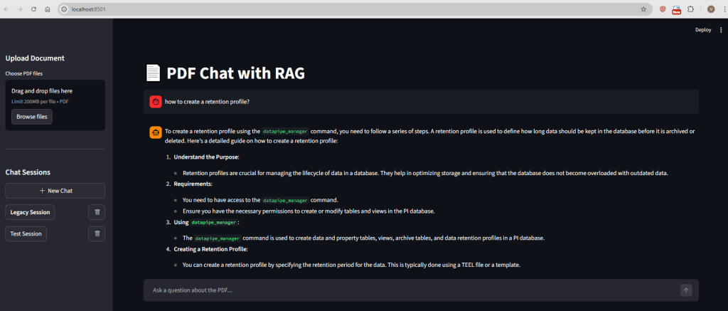- Sessions: Users can create named sessions (e.g., “Legal Docs”, “Project X Specs”).